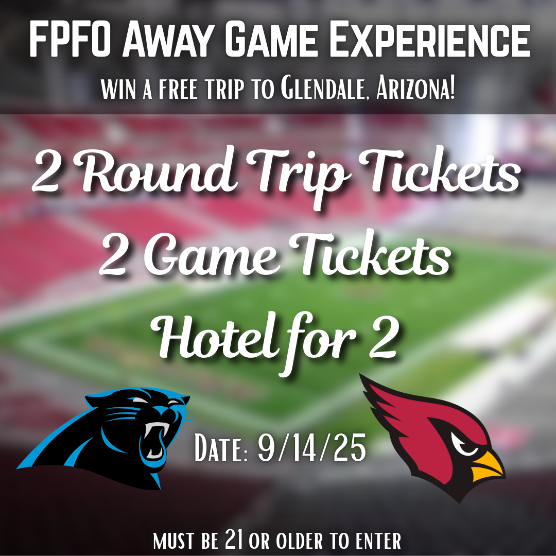 The FPFO Away Game Experience! A ROUND TRIP to Glendale, AZ for 2. TICKETS to the CARDINALS vs PANTHERS game, and a HOTEL room!